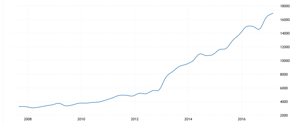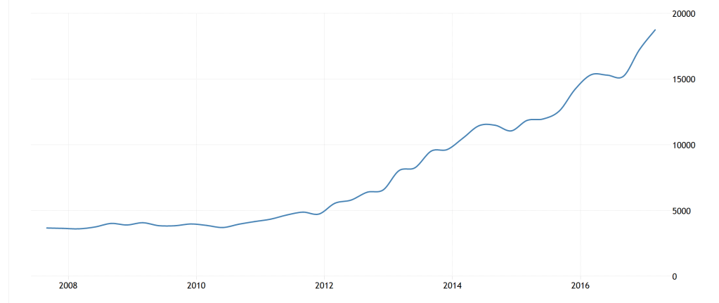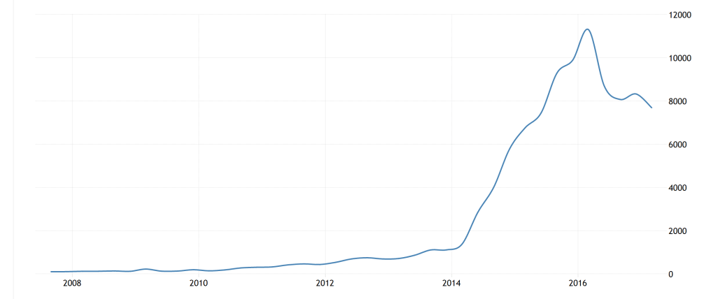 Let’s apply this “chain of dependencies” principle to another domain. Between 1950-2006, international trade grew over 4,000% (i.e. exponentially) as more and more countries entered the global market. Then, between 2006-14, it plateaued.